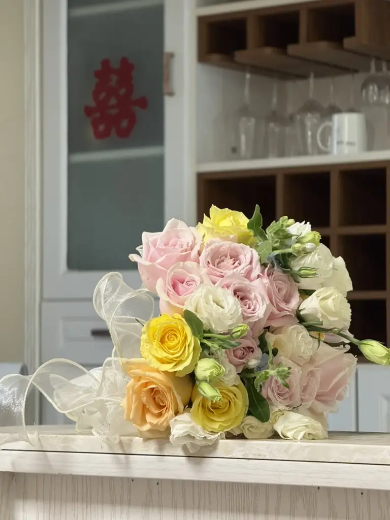 收拾妥当,新郎就捧起花出发了。浩荡的车队打着双闪,还没转几个街角就停了下来。是的,新娘家不过一里开外,发动机还没热起来就已经到了新娘家楼下。