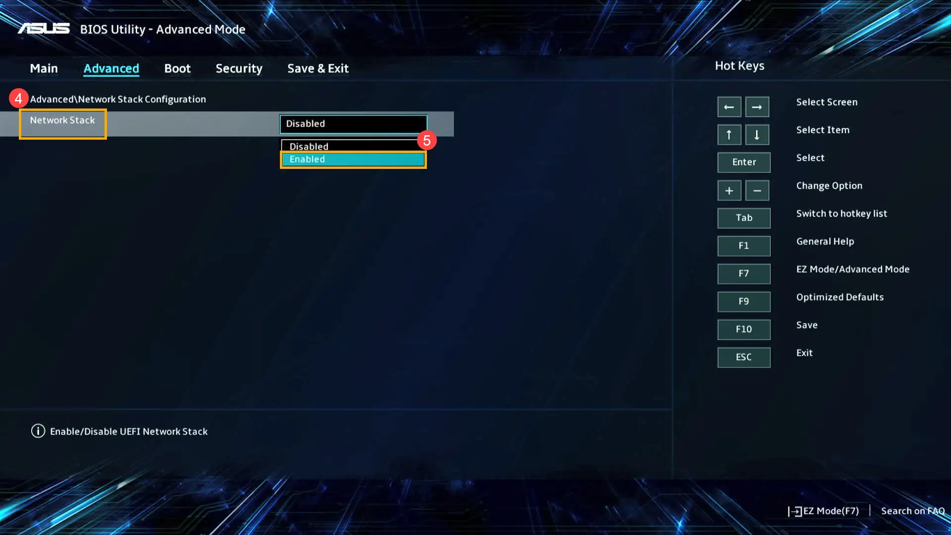 - After entering the Network Stack Configuration, select [Network Stack]④ and set [Enabled]⑤.