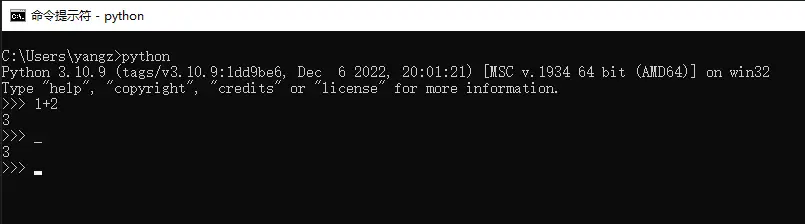 如图,我们先运行了1+2,python返回了3,然后直接运行_,python也给我们返回了3。也就是说_默认情况下是上一次代码运行的返回值。